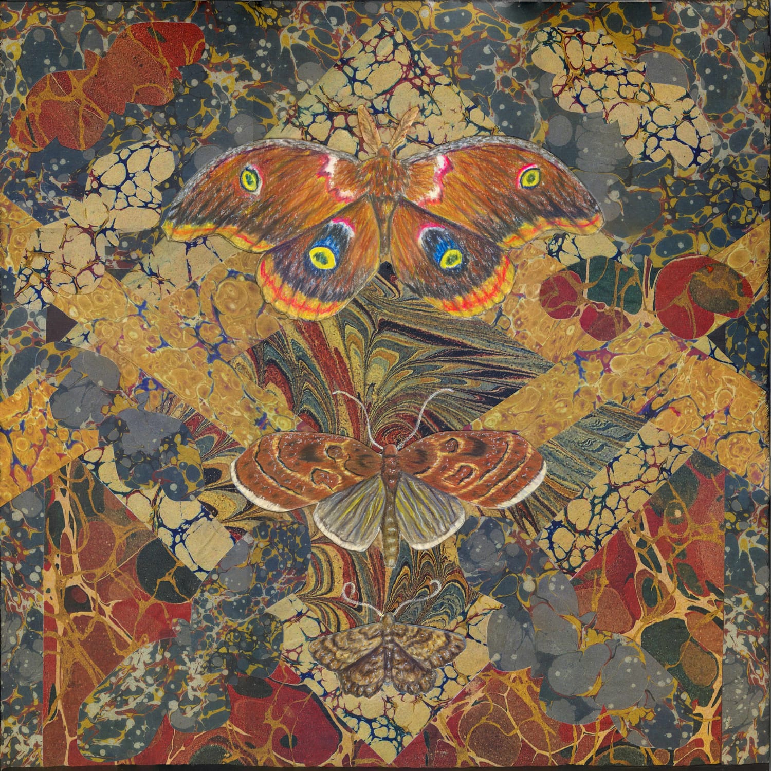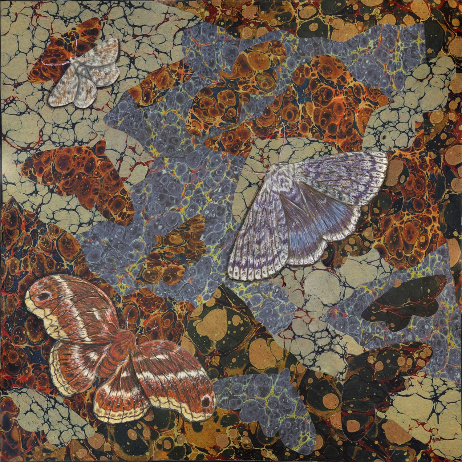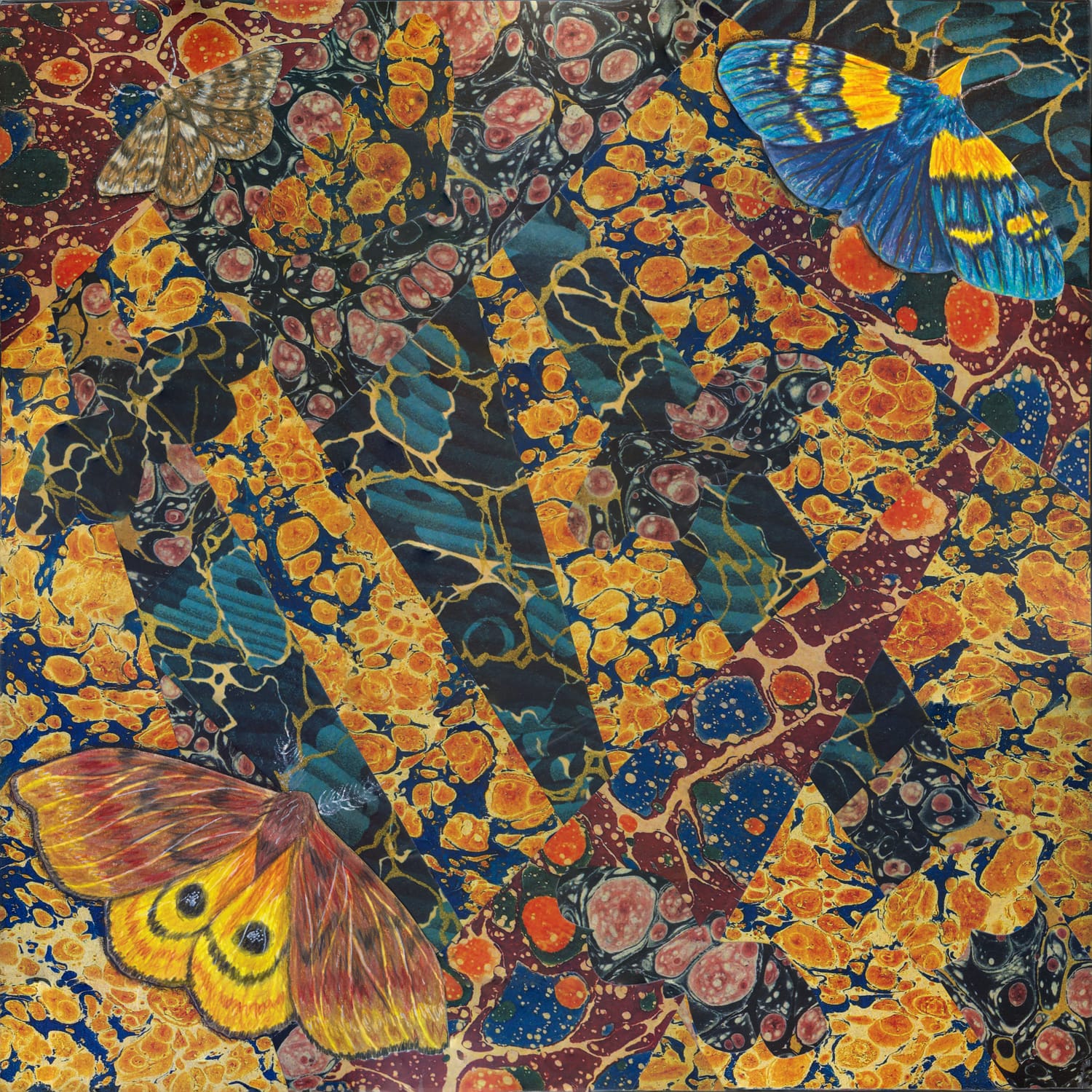 Flying Under The Radar presents ten collages made from scans of vintage marbled papers combined with original colored pencil drawings of moths. Most of these pieces are on 12x12 inch birch panel. I started this series as a compositional study because I enjoyed the aesthetic of moths on marbled papers, but I soon realized the act of making these collages was a meditation.