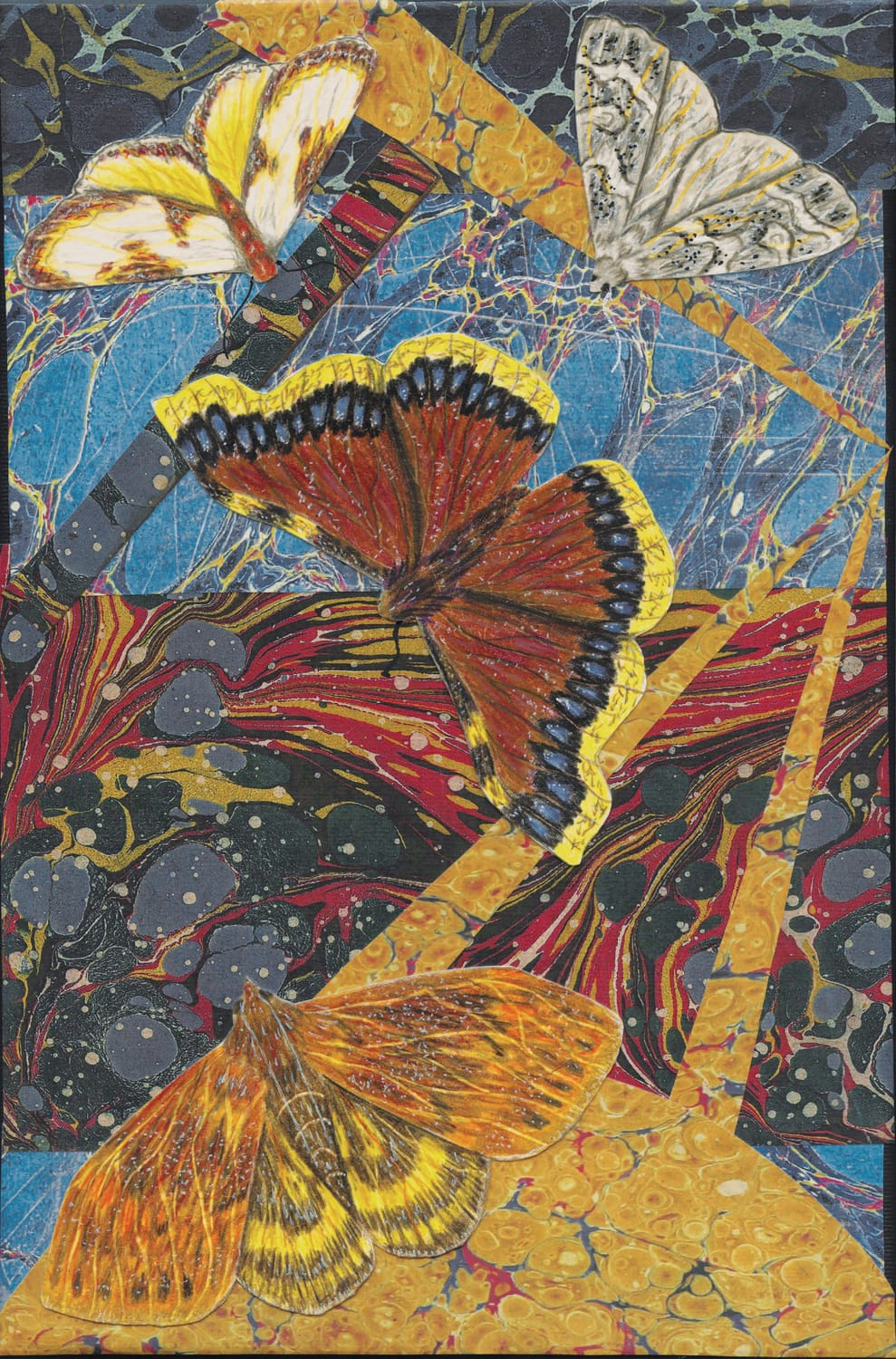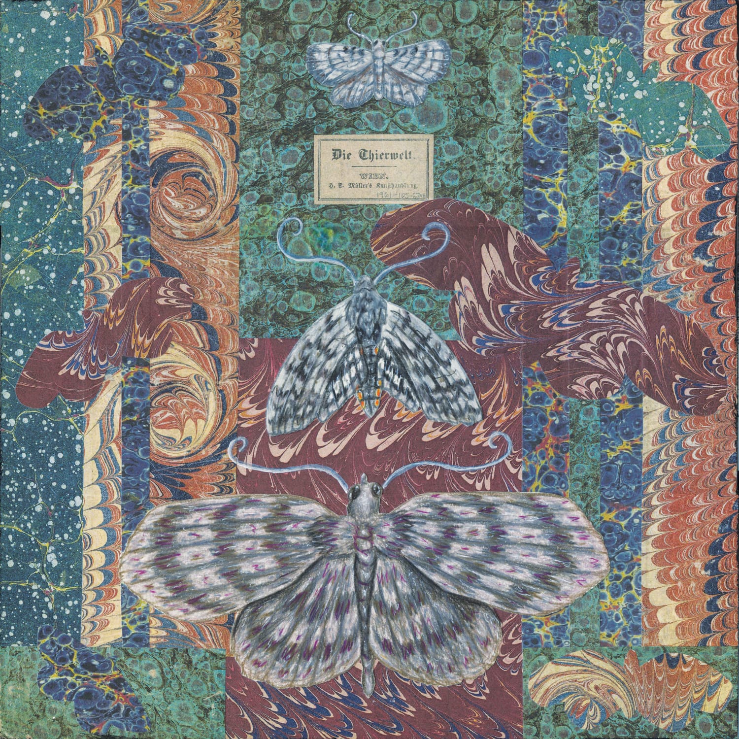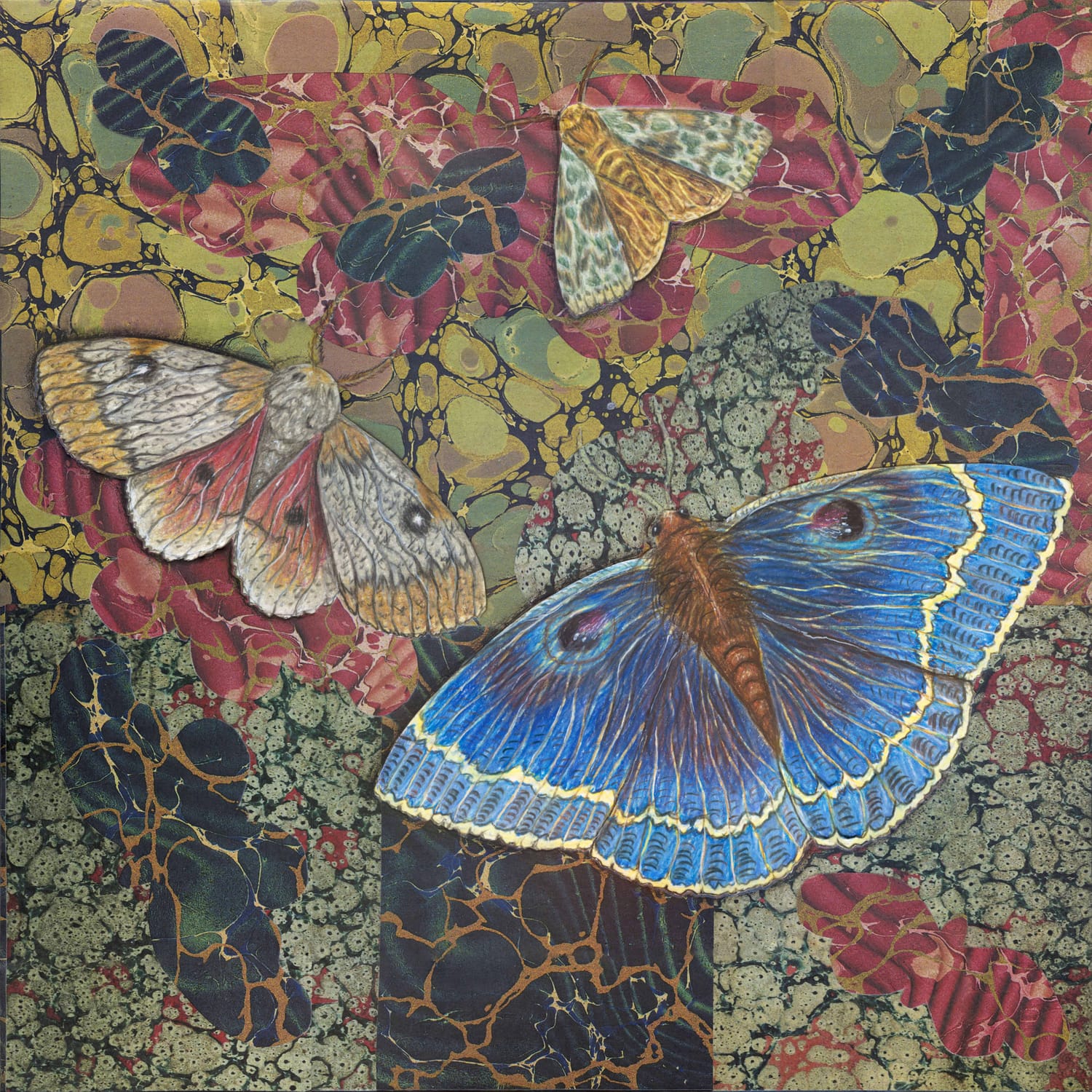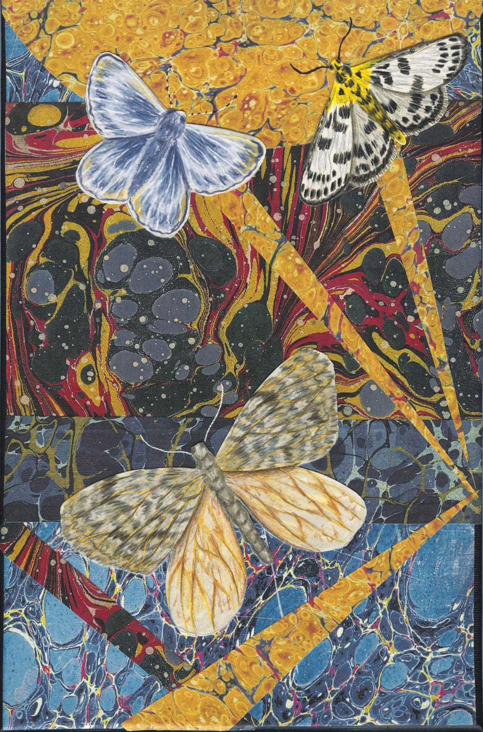 Flying Under The Radar presents ten collages made from scans of vintage marbled papers combined with original colored pencil drawings of moths. Most of these pieces are on 12x12 inch birch panel. I started this series as a compositional study because I enjoyed the aesthetic of moths on marbled papers, but I soon realized the act of making these collages was a meditation.