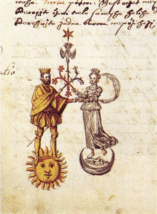 Alchemical marriage of the sun and moon. You'll find a reenactment of this toward the end of Turning the Philosopher's Stone. This image comes from the Rosarium Philosophorum by Jaroš Griemiller z Trebska 1578
